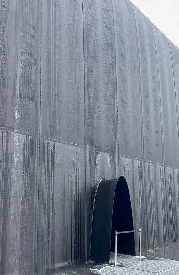 The Future of Life Pavilion, conceived by the android-building scientist, Ishiguro Hiroshi, and designed by architect Jiro Endo, offers a glimpse into the future, exploring alien presences and imaginings on potential extraterrestrial habitability. A visionary work bordering on artist installation, where i-Mesh's experimental pattern interacts with the iridescent liquidity of water, creating a vital system in which carbon fiber becomes a dynamic membrane. The architecture itself resembles a fluid organism, where artifice, nature, and technology can coexist, adapt, and breathe. With its natural cooling capacity, this innovative, lightweight coating serves as a metaphor for a possible future and an ideal harmonious equilibrium.