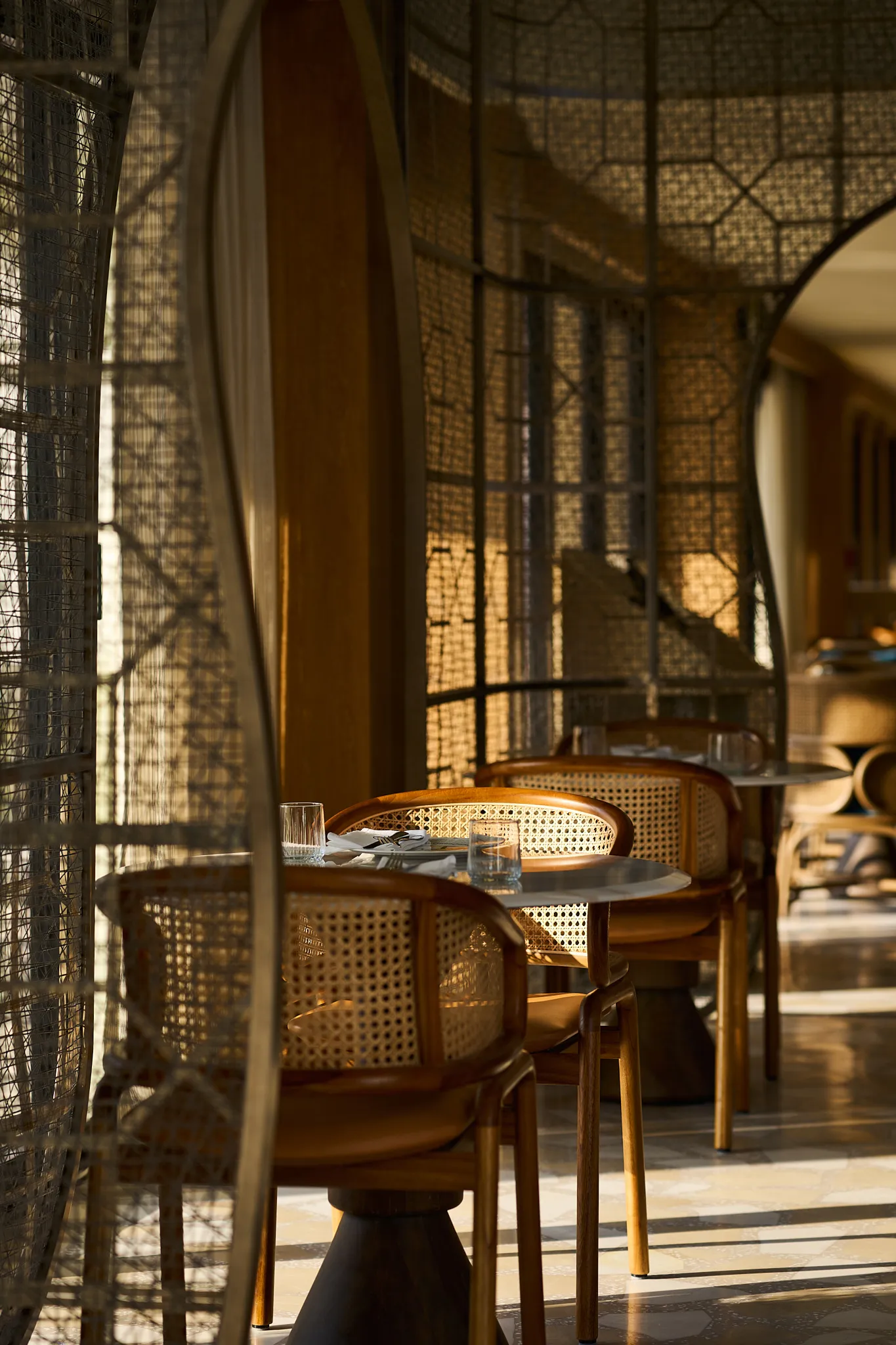Gli interni del ristorante celebrano la storia e la tradizione secolare del luogo, i materiali naturali e la cultura architettonica degli Emirati. In questo racconto, il tessuto è al tempo stesso una soluzione tecnica e un progetto estetico che unisce la dimensione morbida con quella strutturale, in uno spazio in cui convivono natura, memoria e contemporaneità. Con i tessuti protagonisti in ambienti di ospitalità caratterizzati da innovazione della materia, design personalizzato e forte legame con il contesto.
