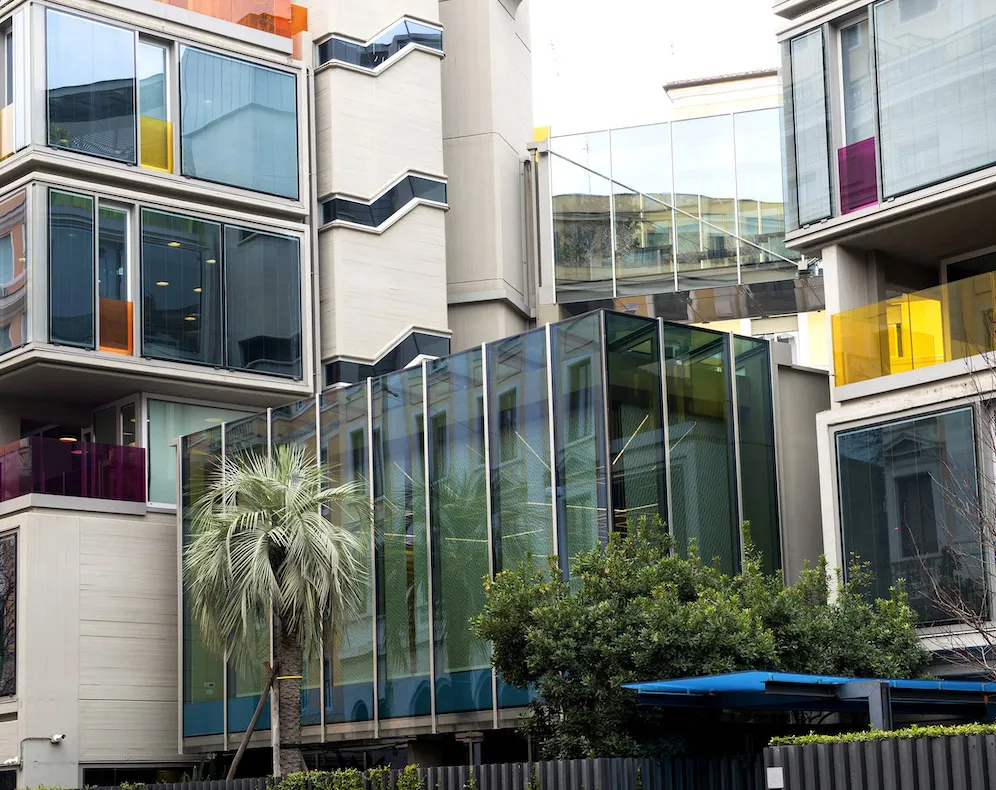 Per la Sala Conferenze Ghella, i-Mesh è stato utilizzato per creare tende piatte non solo per la loro funzione decorativa, dove luci e ombre danzano insieme incessantemente, ma soprattutto per il loro potenziale funzionale grazie alle caratteristiche di bilanciamento energetico e comfort termico, aspetti cruciali nell'architettura bioclimatica, garantendo un risultato esteticamente congruo ma permeabile per un progetto finale duraturo e leggero.