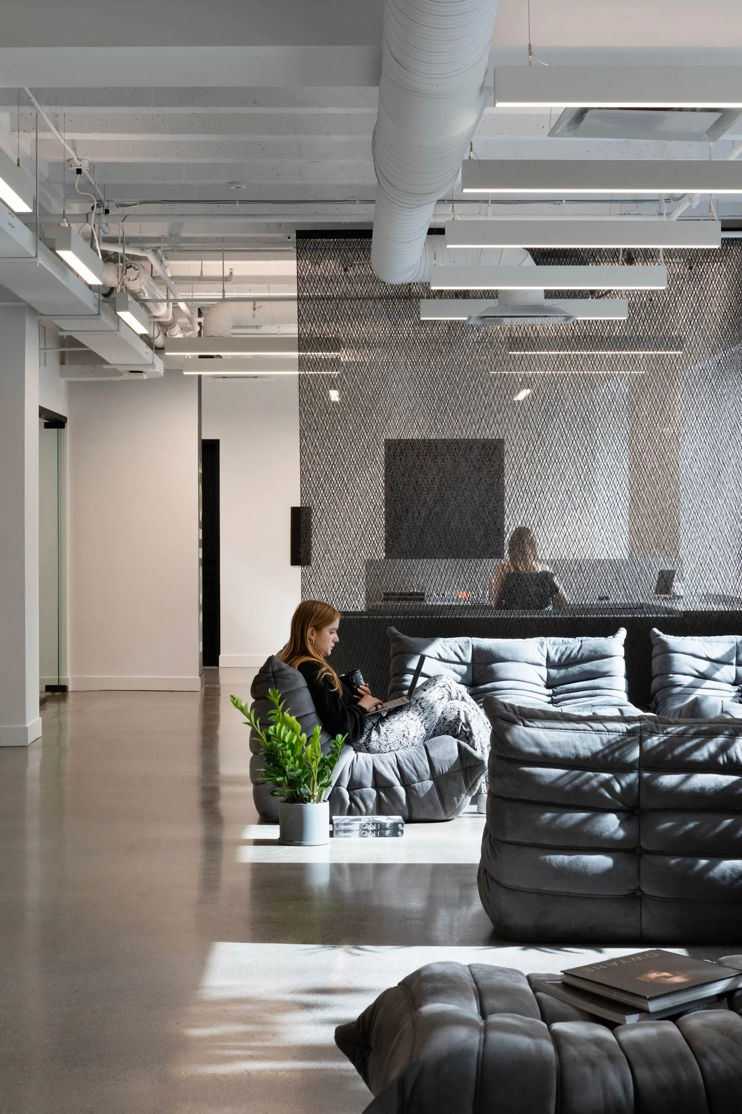 そのような例の 1 つは シンキング・ボックス カナダの会社が考案したプロジェクト リノコンデザインセンター 通信会社用 反社会的、同社のバンクーバーオフィス向けにi-Meshと共同で開発しました。このエアウォールは、カーボンファイバー製の「ランダム」パターンの透水性壁の一種で、心地よいカオス的な直交テクスチャが特徴で、双方向に張力をかけることができ、プライバシーとカスタマイズが可能です。
