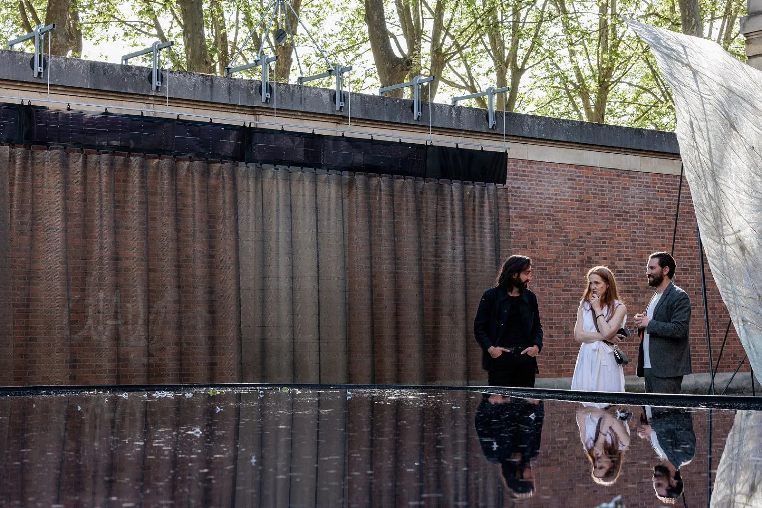 i-Mesh is a veil that reveals the trace of the incident sun on the wall through its weaving pattern and materiality, composed of a mesh of natural volcanic rock fibers. Echoing the ornaments crowning many buildings in Versailles, four artifacts located at the top of the wall transmit the captured energy through sound programmed by Julien Dutertre, which fluctuates according to the intensity of light and energy produced by the textile.